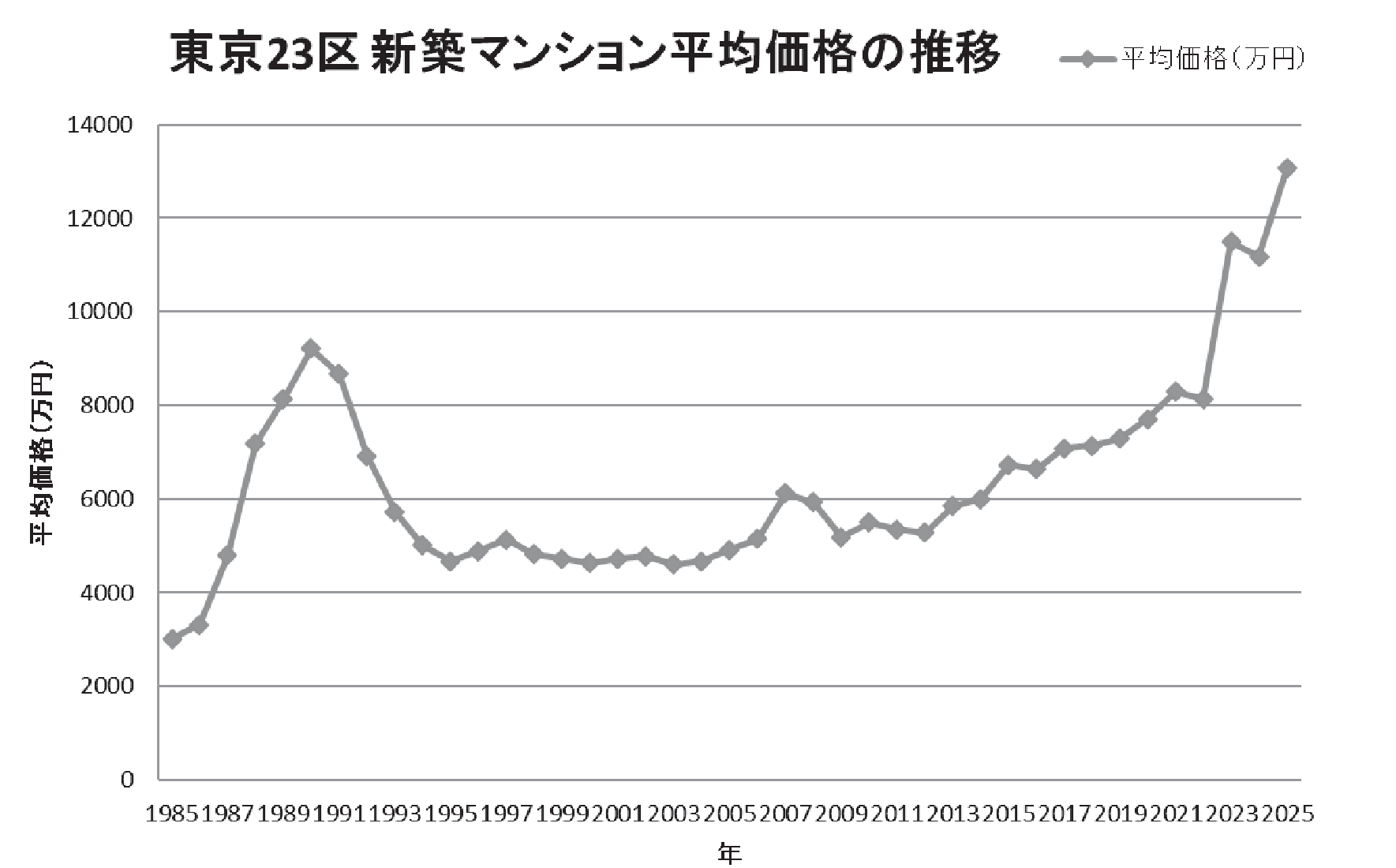 近年のマンション価格の上昇とその背景は、国民生活全体に大きな影響を与え始めています。民間の調査機関である不動産経済研究所によれば、東京23区の新築マンションの平均価格は、平成27(2015)年の6,732万円から、令和7(2025)年上半期には1億3,064万円にまで上昇しました。