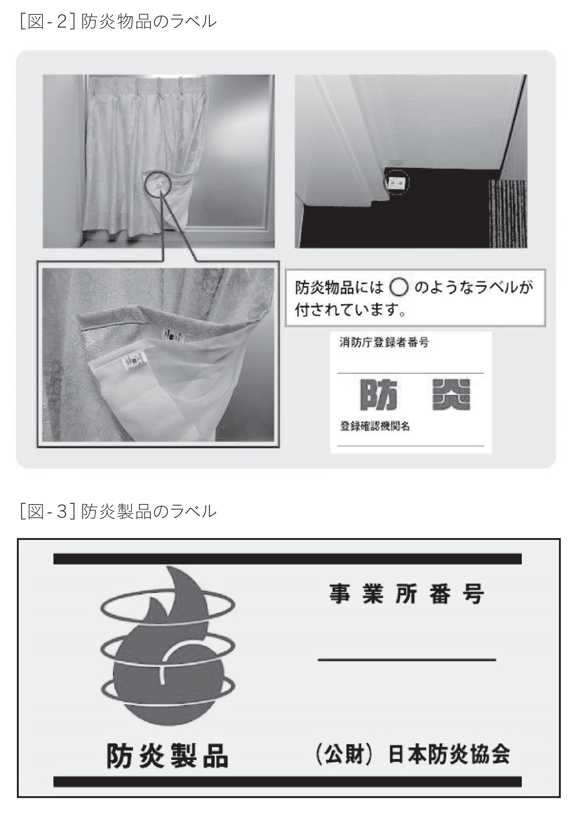 該当する規模の新築マンションでは、あらかじめデベロッパーが「防炎物品」のカーテンやカーペットを用意していることもあります。しかし、中古マンションを購入した場合や、賃貸住戸に入居したときは、自分で用意しなければなりません。「防炎物品」には[図-2]のようなラベルが貼られているので、カーテンやカーペットを購入するときは、確認する必要があります。