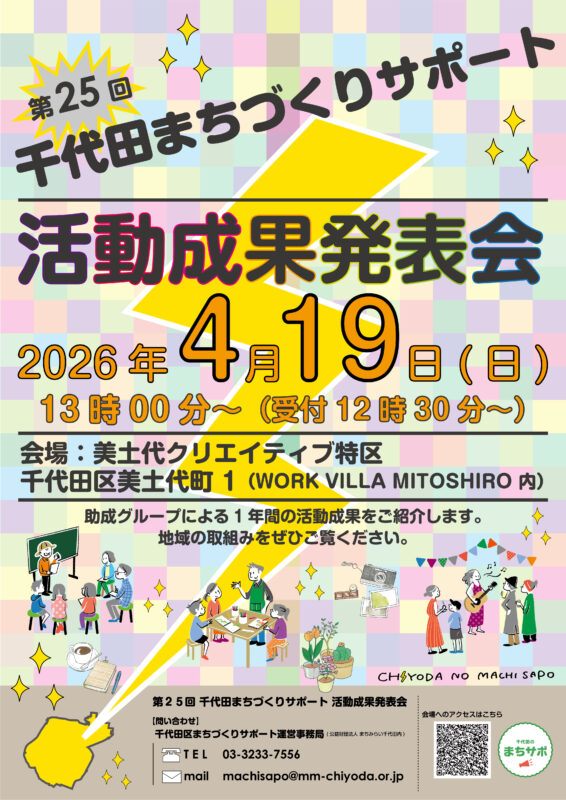 千代田まちづくりサポート運営事務局(公益財団法人まちみらい千代田内) TEL:03-3233-7556 / Mail:machisapo@mm-chiyoda.or.jp |