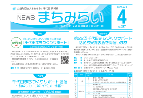 NEWSまちみらいNo.217(令和5年4月20日号)を発行しました 2023.04.21 財団からのお知らせ NEWSまちみらいNo.217(令和5年4月20日号)を発行しました。 左の画像をクリックし、ご覧ください。 本紙はまちみらい千代田が実施する事業などについて、千代田区内に広く情報提供するため、毎月20日に「広報千代田」に折り込みで発行しています。 ⇒ NEWSまちみらいバックナンバーはこちら