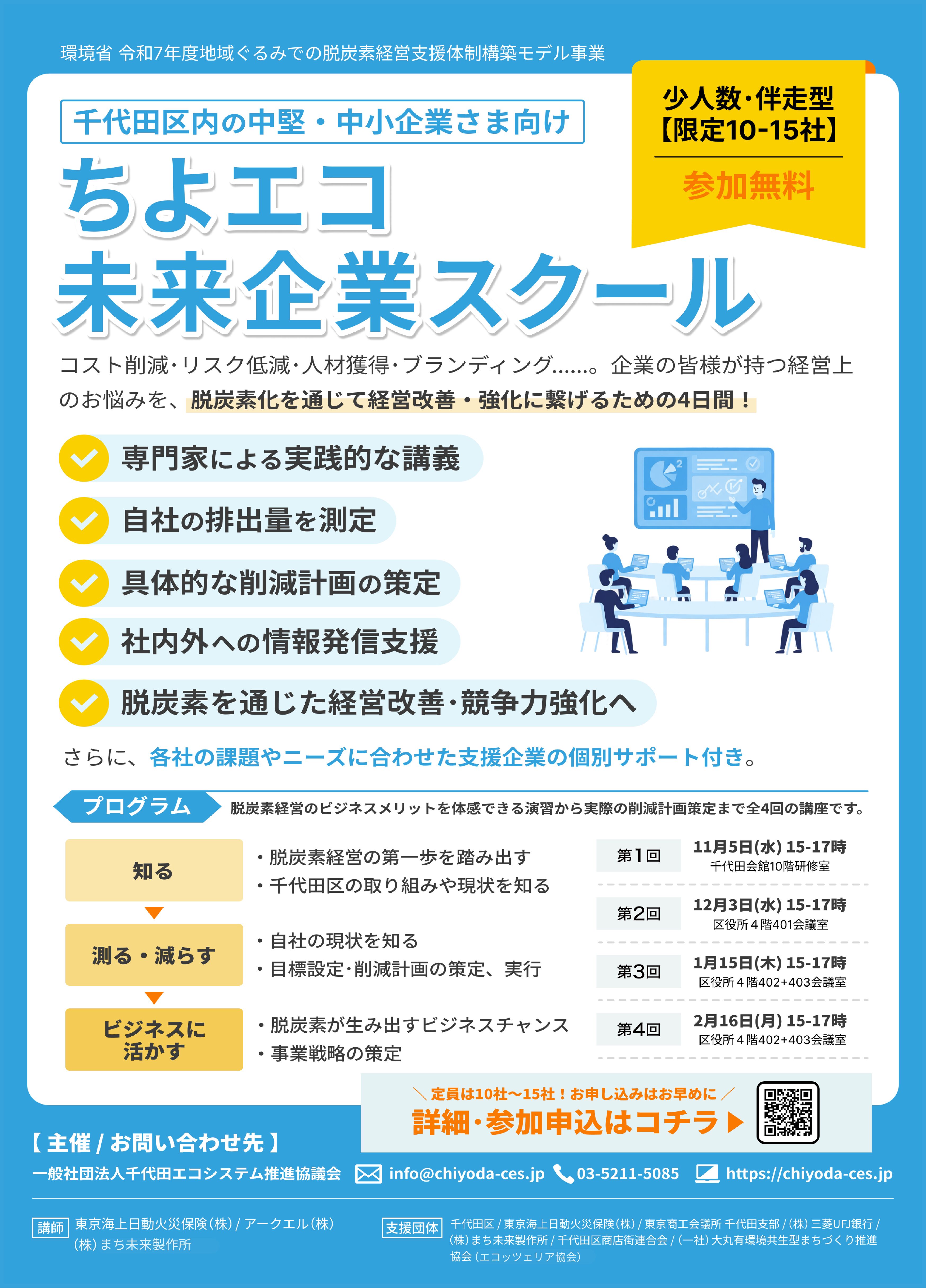 千代田区で脱炭素経営を支援する千代田エコシステム推進協議会(CES)が、中小企業向けに実務型の「ちよエコ未来企業スクール」を開講します。 「eサイクルちよだ」入札体験等、経営力強化につながる脱炭素の第一歩を実践的に学べる内容です。