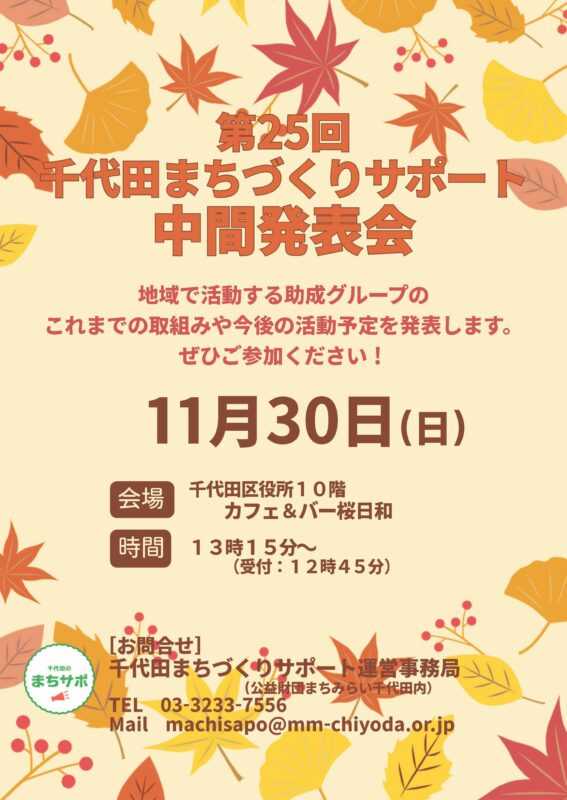 第25回千代田まちづくりサポート中間発表会の開催 2025.11.13 財団からのお知らせ 第25回千代田まちづくりサポート中間発表会 「千代田まちづくりサポート」は、現在、将来にわたって千代田区を活気ある、住みよい魅力的なまちにしようとする、市民の自主的で主体的なまちづくり活動を応援し、助成する事業です。 公開審査会にて助成決定された13グループが、これまでの活動状況や今後のスケジュールについて、発表します。 詳細はこちら
