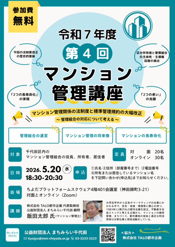 まちみらい千代田では、千代田区内のマンション居住者や所有者を対象に、マンション管理の基本が学べる「マンション管理講座」を開催しています。令和7年度第4回は「マンション管理関係の法制度と標準管理規約の大幅改正 ~管理組合の対応について考える ~」をテーマに開催します。